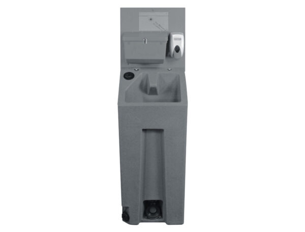 Las características incluyen: capacidad de agua limpia de 83 litros, funcionamiento de la bomba de pie, el agua sucia se drena directamente al tanque de desechos del baño portátil, la espita moldeada crea un diseño antivandálico, bomba de pie de 6.8 litros por minuto.